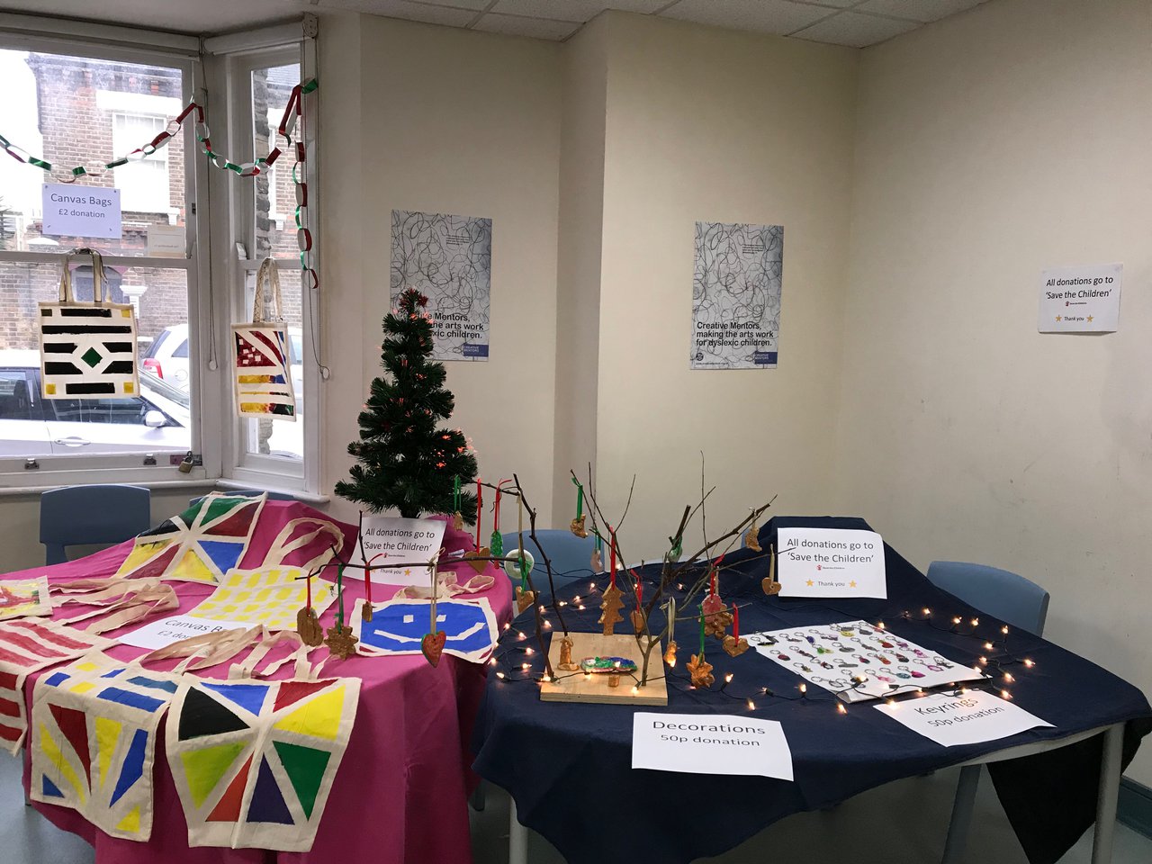Students from years 7–9 worked with mentors, Alice and Jaz, to design and make products (decorations, keyrings and tote bags) to sell at the Winter Fair. Decorations were made from clay, keyrings were made using shrinkie paper and the tote bags were made using stencils and paint.